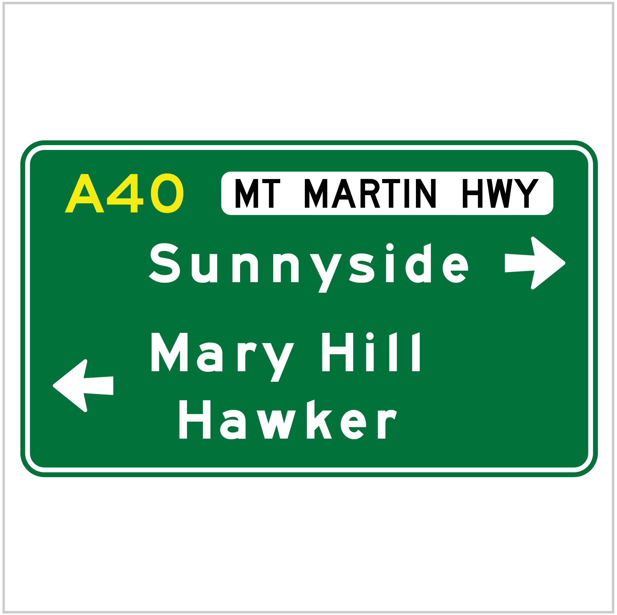 A white legend on a green background is used for signs such as advance direction signs, finger boards, intersection and special direction signs, advance exit and exit direction signs on freeways, reassurance direction signs and kilometre posts.